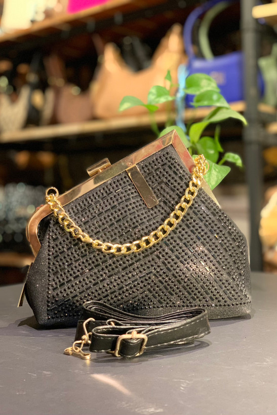 کیف مجلسی مشکی با استایل کج و طراحی منحصربهفرد، ترکیبی از زنجیر دستی شیک و بند بلند متفاوت؛ یک طرف بند نگینی و طرف دیگر اکلیلی. ساختهشده با دقت و ظرافت برای استایلی درخشان در مهمانیها و مجالس خاص